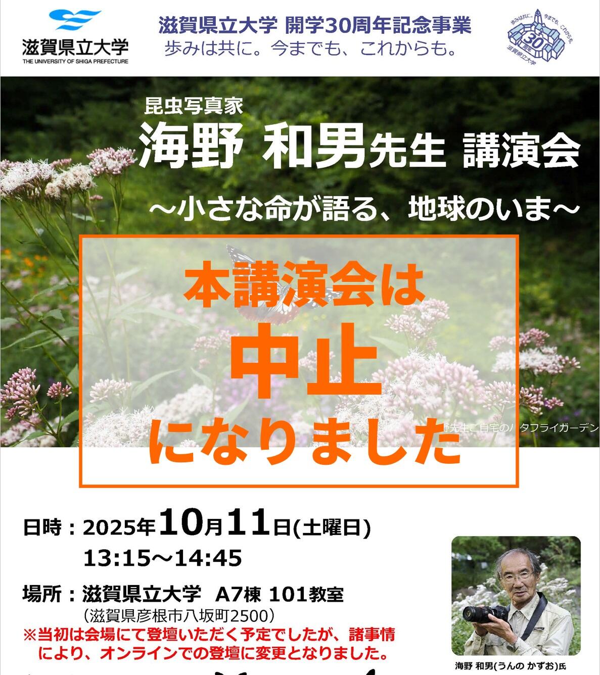 昆虫写真家 海野和男先生 講演会【中止】のお知らせ/バタフライガーデン観察会は【開催】