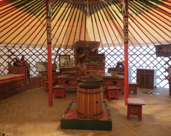 モンゴル人は太古から牧畜業に従事し遊牧生活を送ってきたため、設営と運搬が容易で、気候、風土に適した移動できるテント住居・ゲルを生み出しました。本学がモンゴル国で購入したゲルおよび調度品は、その遊牧生活の生活様式を示すもので、今でも現地の遊牧民の住居として使用されています。